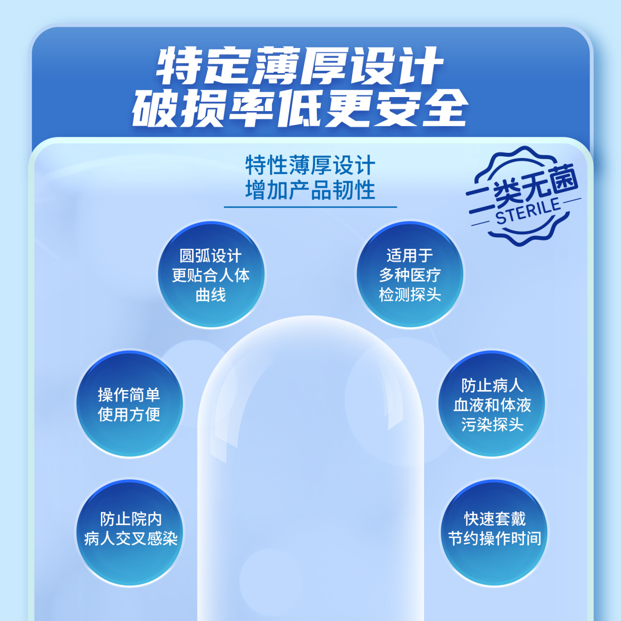 适配医院多种超声设备,如腹部超声探头、三维容积探头、阴道超声探头等,安装于超声探头的透声窗上,避免超声探头与人体皮肤的直接接触,以防止交叉感染和医源性感染的发生。多探头一次性适用,方便清洁、省事并减少医务人员的工作负担。